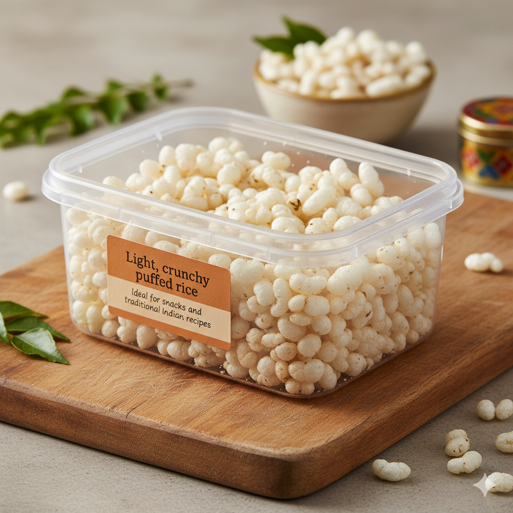 Light, crunchy puffed rice ideal for snacks and traditional Indian recipes.