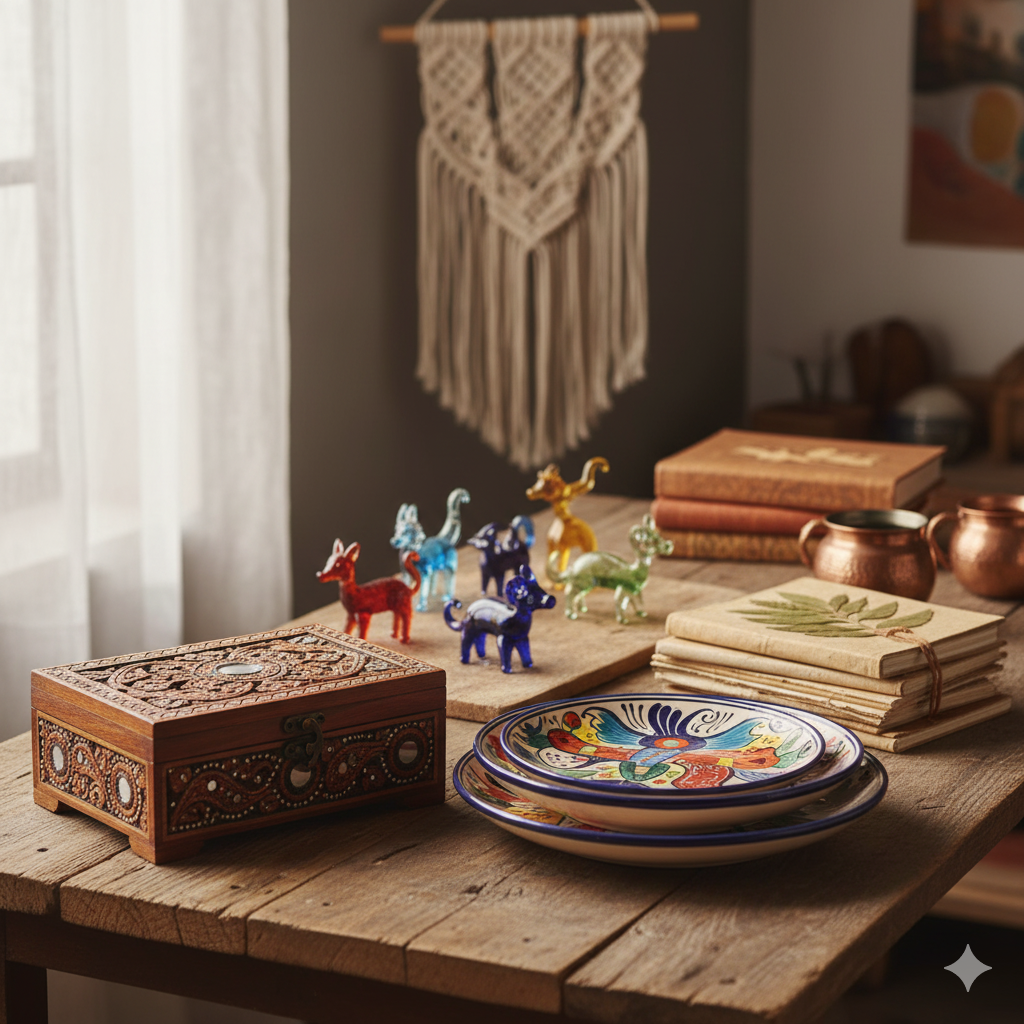 A diverse range of handmade Indian crafts made by skilled artisans, including decorative and utility items..